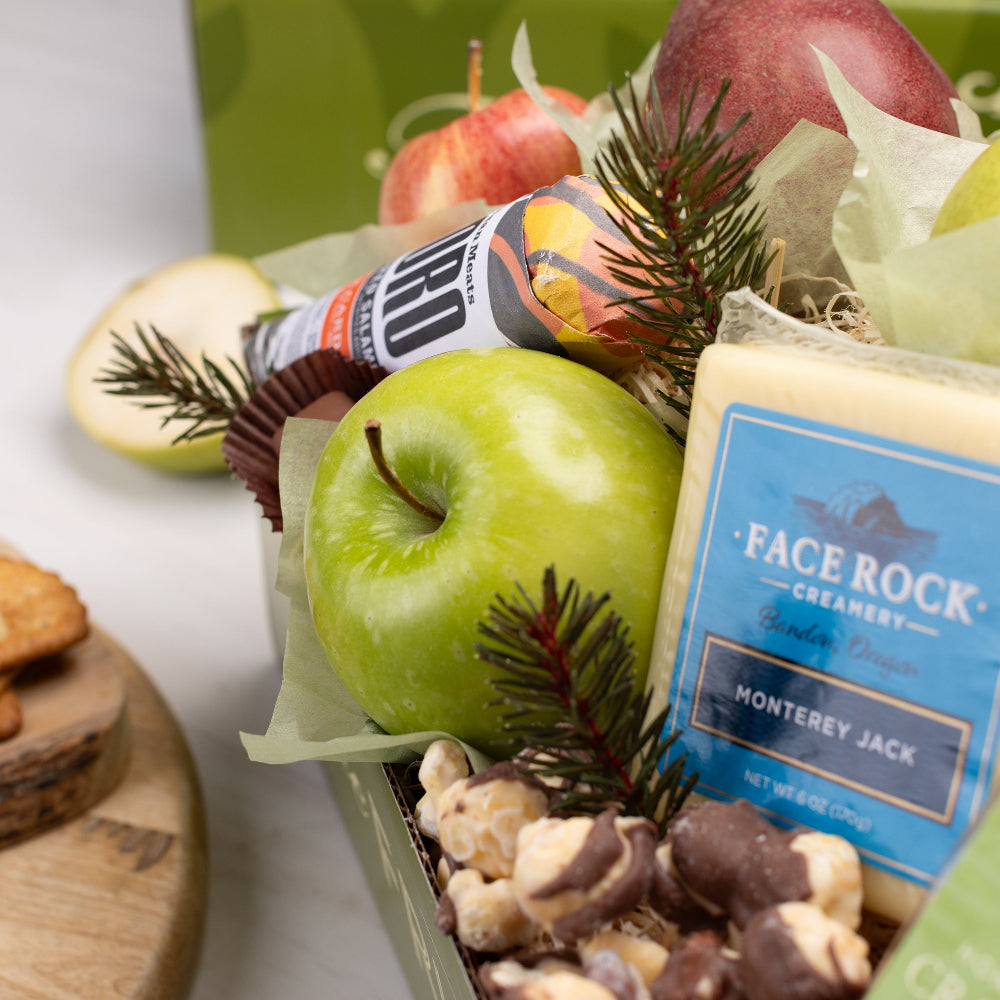 Unwrap the delight of the season with our Signature Holiday Gift Box, a harmonious blend of sweet and savory indulgences. Discover the opulence of Milk Chocolate Sea Salt Caramels, Salami, and Face Rock Monterey Jack Cheese, balanced by the crispness of Honey Wheat Crackers. This exquisite assortment highlights our dedication to quality fruit, featuring an assortment of fresh apples and pears. Ideal for gifting, it embodies our commitment to creating exceptional fruit baskets and delivering happiness to your doorstep.